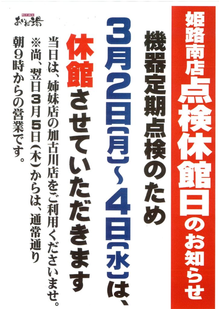 姫路南店点検休館日のお知らせ